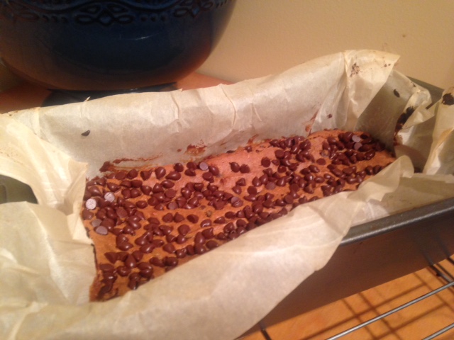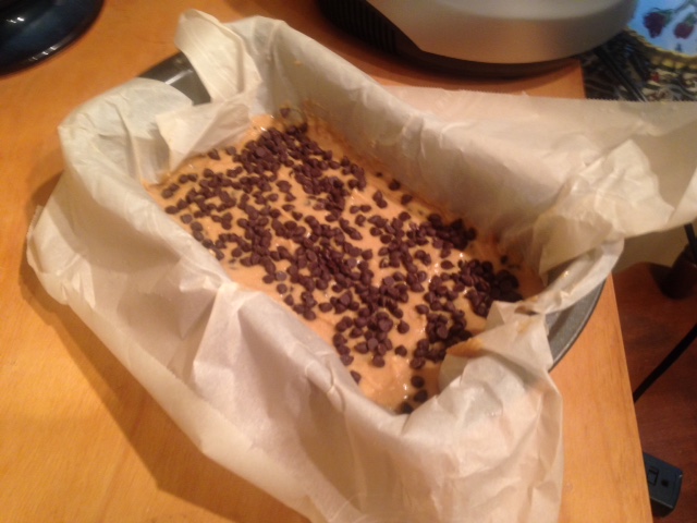 As directed by the recipe, I pressed the remaining ¼ cup of chocolate chips into the top of the mix. And then, I popped it in the preheated oven and set my timer for an hour.